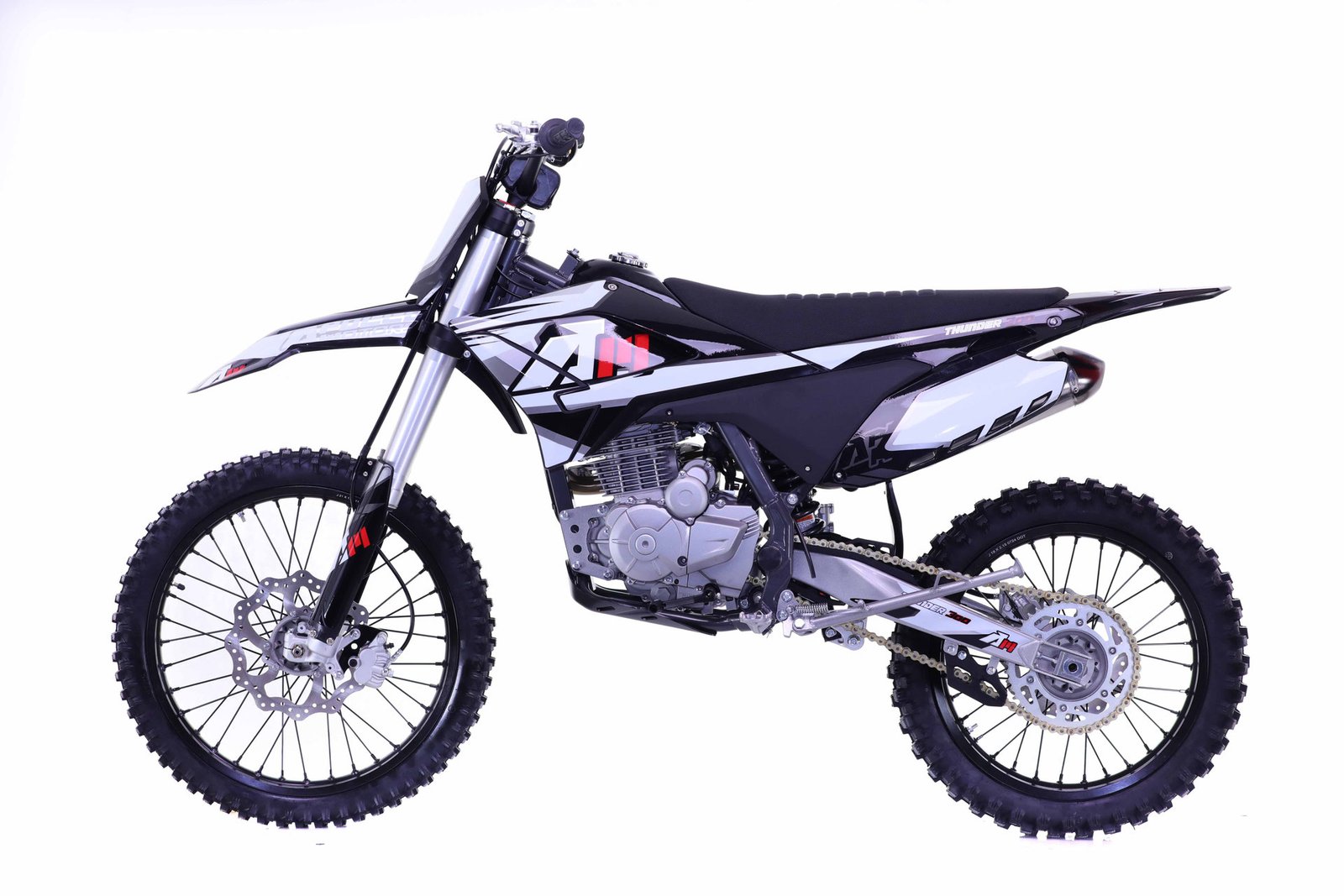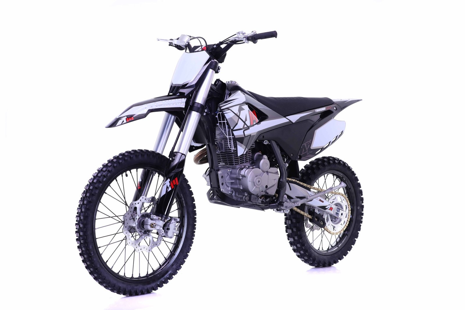 The Apollo THUNDER rides on durable 7-series aluminum rims and hubs. The front tire measures 80/100-21, and the rear tire is 100/90-18. Both are Yuanxing off-road tires designed for excellent traction on tough terrain. With an impressive ground clearance of 340 mm, the bike clears obstacles easily and handles rough trails with confidence.