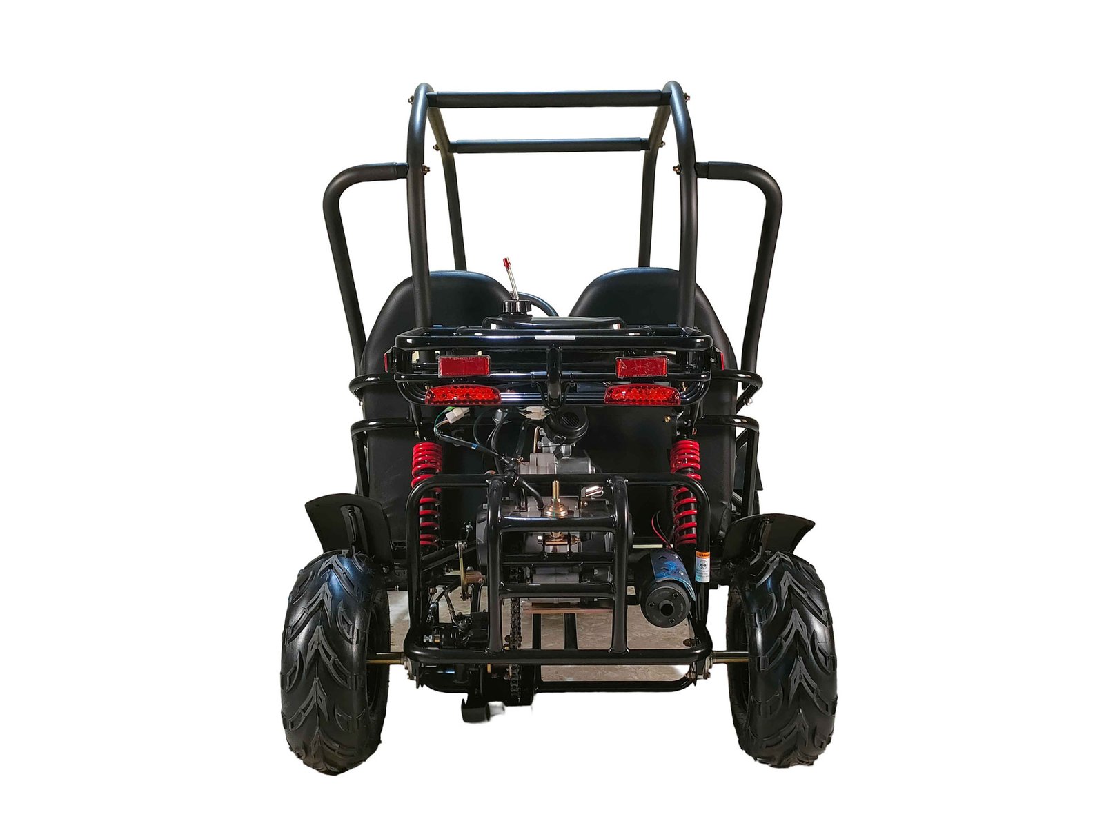 This go-kart comes with a 3-speed transmission, including reverse gear, giving drivers versatile control in different conditions. For added safety, a 35W white headlight provides bright illumination, making it easier to drive even in low-light settings.