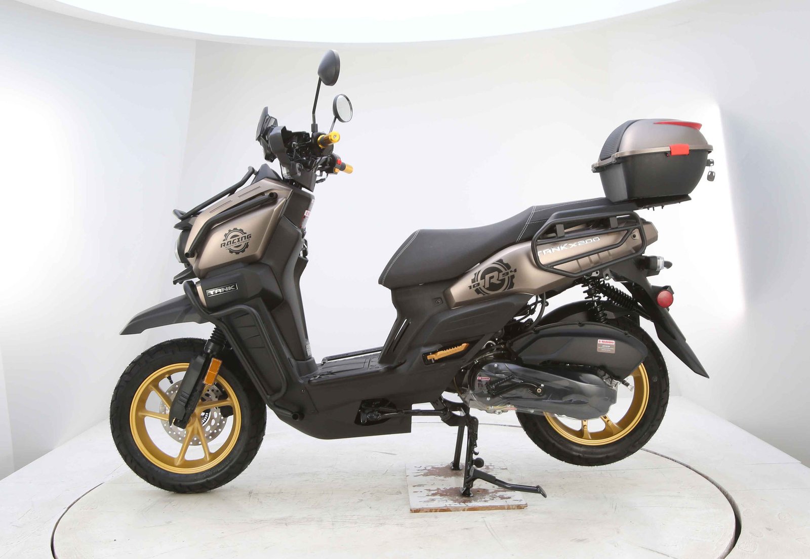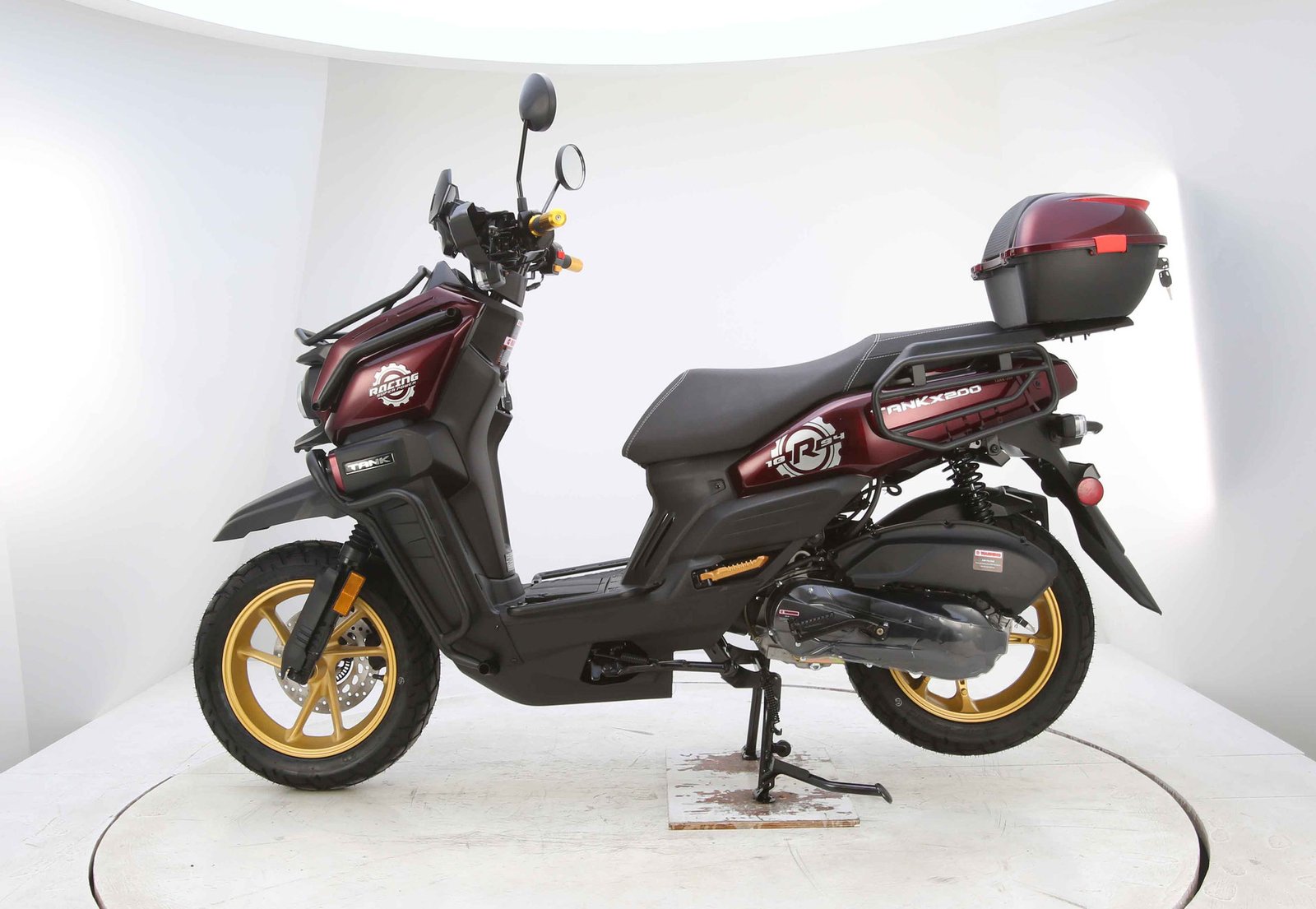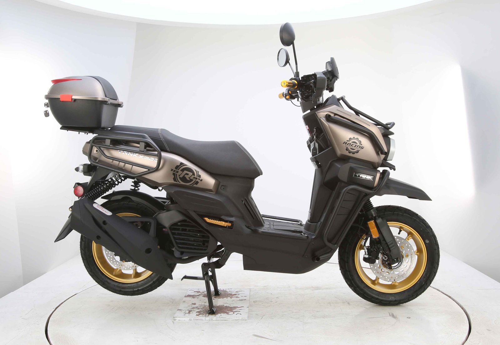 Designed for comfort and control, the TANK PRO X200 includes telescopic front suspension and spring hydraulic rear suspension to absorb bumps and road imperfections. It rides on 130/60-13 tires, providing solid traction and stability. Safety comes from efficient disc brakes that ensure strong and reliable stopping power.