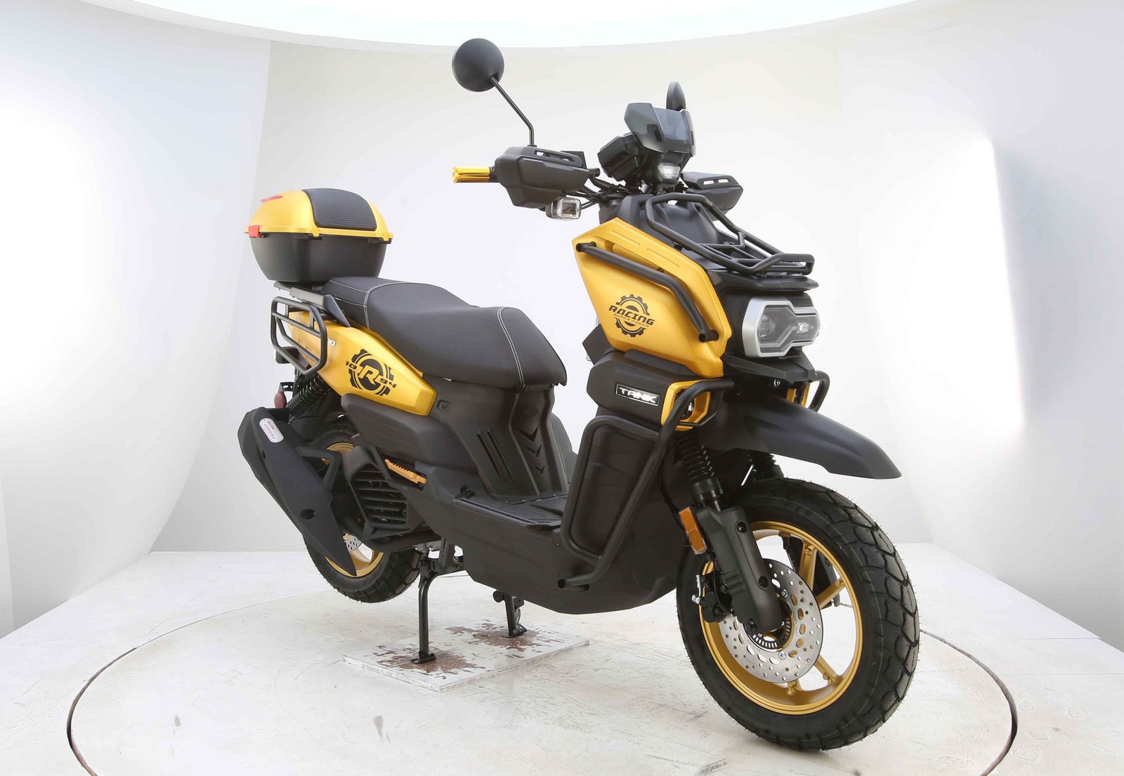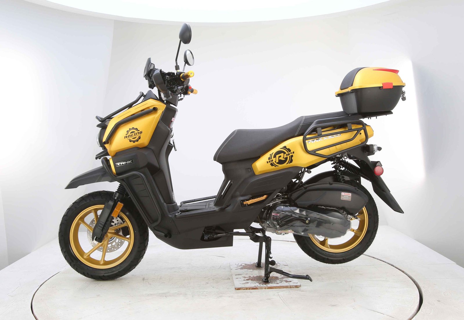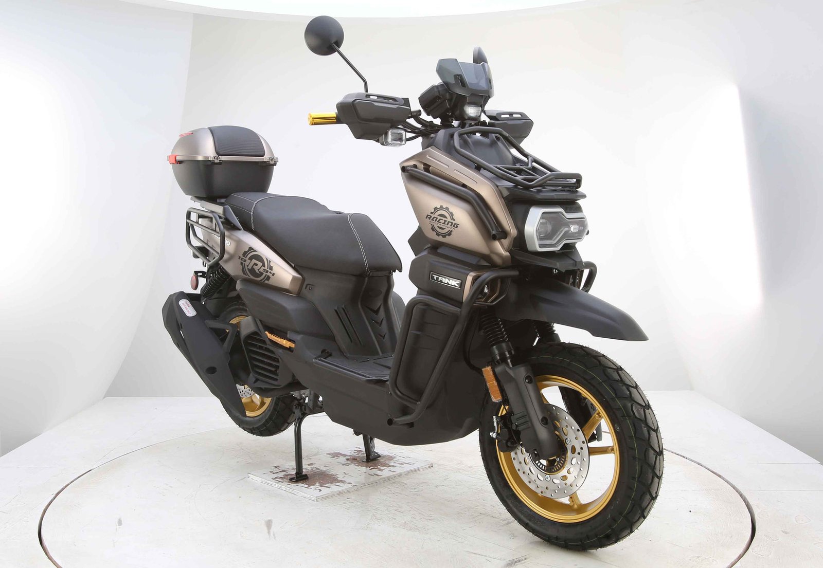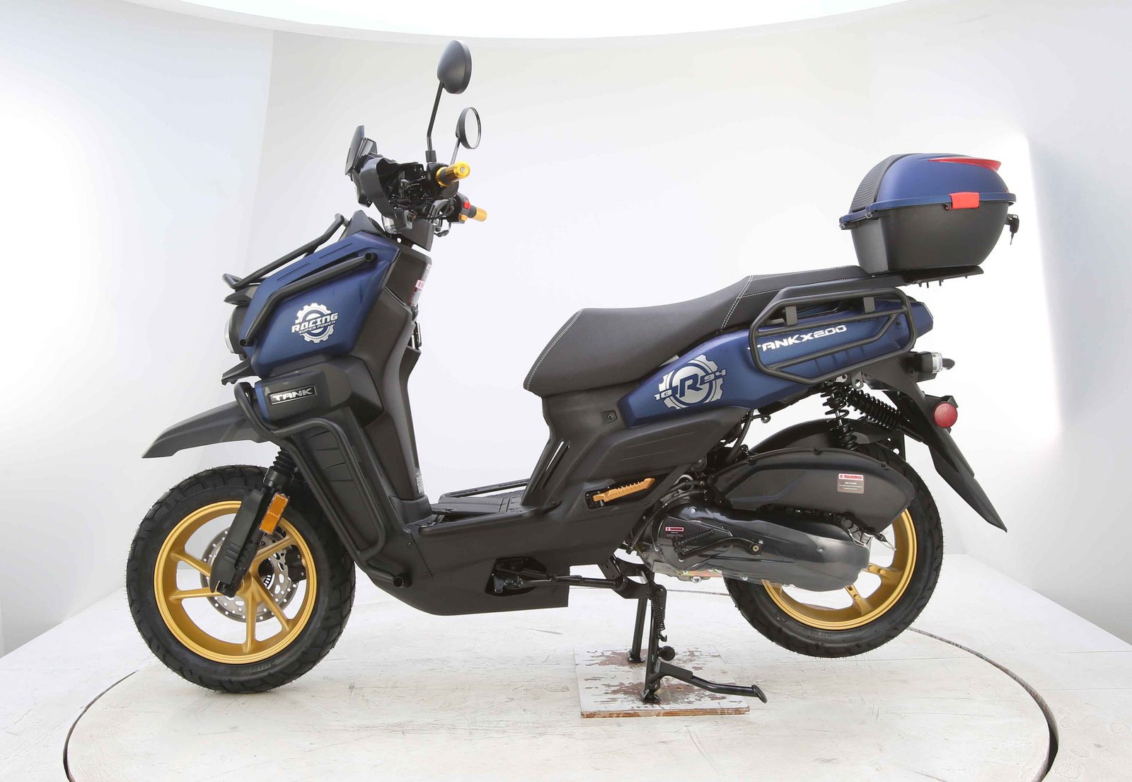 Designed for comfort and control, the TANK PRO X200 includes telescopic front suspension and spring hydraulic rear suspension to absorb bumps and road imperfections. It rides on 130/60-13 tires, providing solid traction and stability. Safety comes from efficient disc brakes that ensure strong and reliable stopping power.